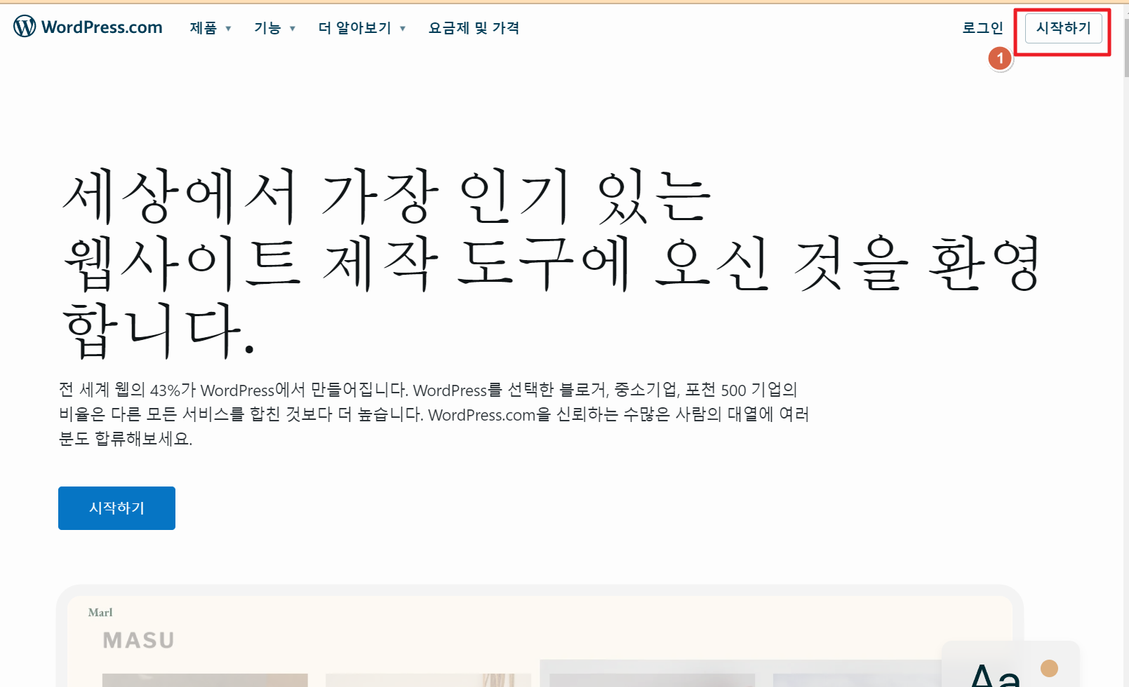 워드프레스 홈페이지에 접속했다면, 오른쪽 상단에 시작하기 버튼을 눌러 회원가입을 합니다.